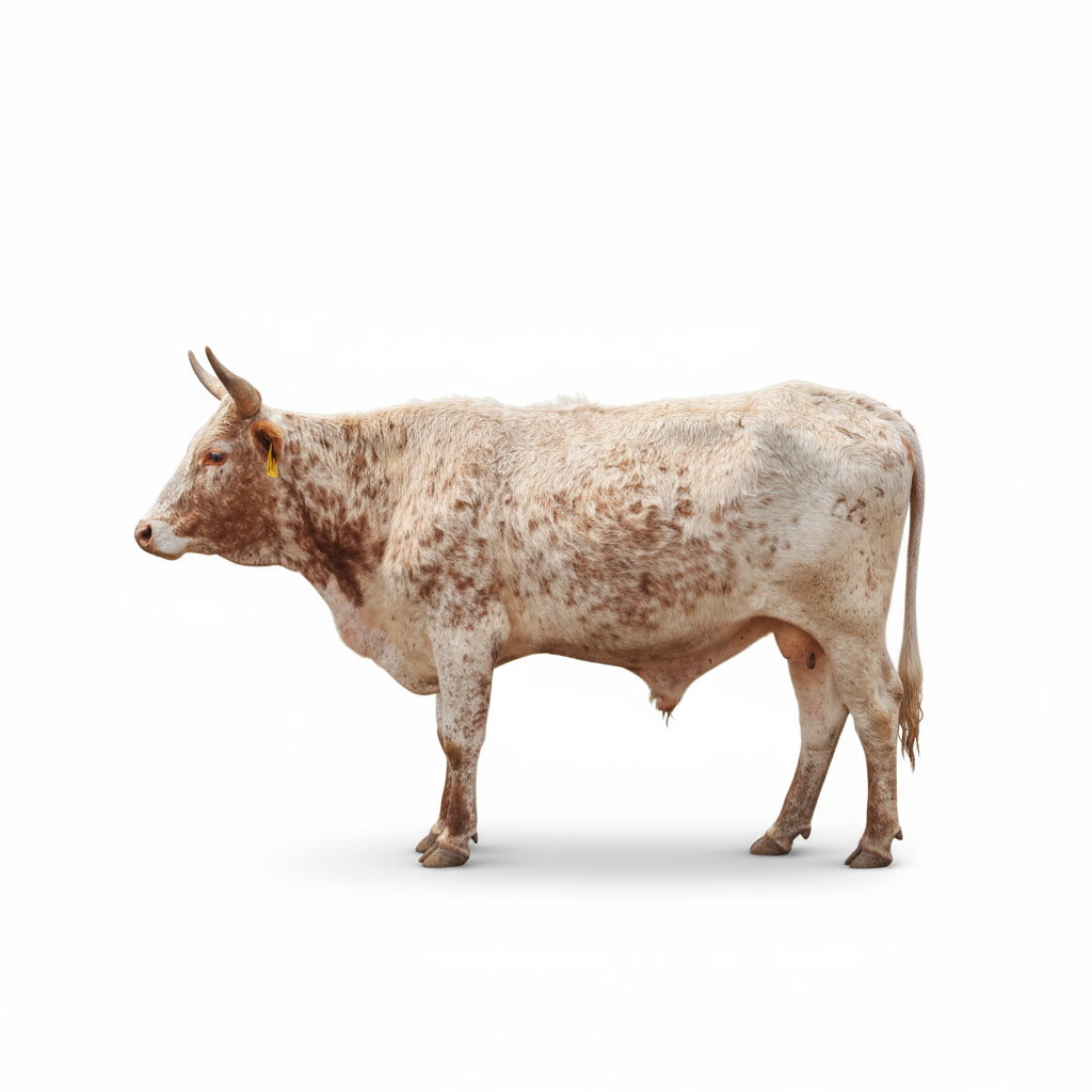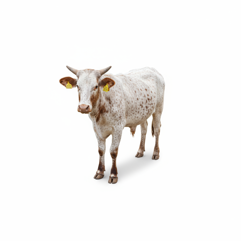 Tag 322: cream coat with red speckles, feminine frame and tidy feet. Polled/short scurs, kraal-accustomed and easy to handle. R16 500.